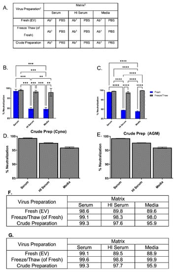 Effect of nonhuman primate sera on MV neutralization of freshly prepared and freeze/thawed preparations of monkeypox virus. (A) A general outline of the experimental design. (B) Fresh preparations of monkeypox virus were split and incubated with either cynomolgus (Cyno) serum or HI serum and anti-L1 ab (7D11) or PBS (n = 3). (C) This was repeated with AGM serum (n = 2). A portion of these samples were freeze/thaw/sonicated before the addition of serum, antibody, or PBS control (B,C). (D,E) Our animal virus stock (crude stock) that has undergone multiple freeze/thaw and sonication cycles was treated similarly, n = 3. Statistical differences, using a two-way ANOVA and Sidak’s multiple comparisons (Graphpad Prism), were noted (**** p < 0.0001, *** p < 0.001 and ** p < 0.01). Consolidated table of neutralization values are given for cynomolgus macaque sera (F) and AGM sera (G). There was no statistical difference between serum, crude, and any of the freeze thaw groups (p > 0.05). There was also no statistical difference between analogous cynomolgus macaque and AGM treatment groups (p > 0.05).