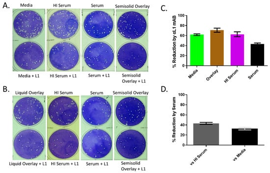 Effect of serum on monkeypox virus comet formation. (A,B) Two concentrations of monkeypox virus were adsorbed on Vero E6 cells for 2 h and unattached virus was subsequently removed by washing. A final concentration of 10% cynomolgus serum or heat-inactivated serum in the presence or absence of anti-L1 antibody (1:500) was used to overlay the cells and a 1.5% methylcellulose overlay with and without anti-L1 antibody was utilized as a no-comet control and to determine the effect the antibody on the primary plaques. (C) Percent primary plaque reduction in the presence of anti-L1 antibody within each matrix listed on the X axis. (D) Percent primary plaque reduction of serum using either the heat-inactivated serum or media to normalize. High virus concentration was a target of 100 pfu/well, whereas intermediate virus concentration was a target of 50 pfu/well.