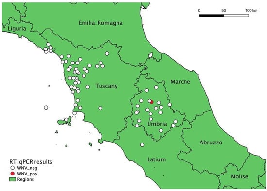 Geographical distribution of sampling sites and positive case location (QGIS map). The map shows the sites of wild birds sampling (white dots) distributed in Umbria, Lazio, Tuscany, and the location of the WNV-positive little grebe (Tachybaptus ruficollis subsp. ruficollis) (red dot).