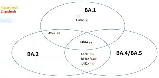 The Stanford University Coronavirus Antiviral and Resistance Database (https://covdb.stanford.edu/search-drdb, accessed on 1 September 2022) shows that tixagevimab has no efficacy against S371F, F486S/V, Q493R, and Q498R, while cilgavimab has no efficacy against R346X, E406W [], K444E/Q/R, and V445A. In addition, none of the 2 mAbs have efficacy against E484A/K (Figure 1). Resistance can be determined by either viral neutralization assays [] or biolayer interferometry []. When it comes to Omicron sublineages, these mutations compromise the efficacy of the ingredients (Table 2 and Table S1).