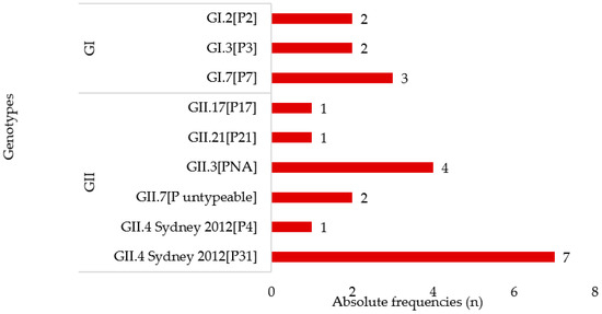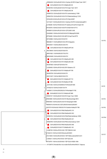- Cannon, J.L.; Bonifacio, J.; Bucardo, F.; Buesa, J.; Bruggink, L.; Chan, M.C.-W.; Fumian, T.M.; Giri, S.; Gonzalez, M.D.; Hewitt, J.; et al. Global Trends in Norovirus Genotype Distribution among Children with Acute Gastroenteritis. Emerg. Infect. Dis. 2021, 27, 8. [Google Scholar] [CrossRef]