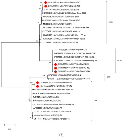 Chilaúle, J.J.; Munlela, B.; Mans, J.; Mabasa, V.V.; Marques, S.; Bauhofer, A.F.L.; Jane, G.; Anapakala, E.; Oliveira, F.; Cossa-Moiane, I.; et al. Norovirus Genetic Diversity in Children under Five Years Old with Acute Diarrhea in Mozambique (2014–2015). Viruses 2022, 14, 2001. https://doi.org/10.3390/v14092001
