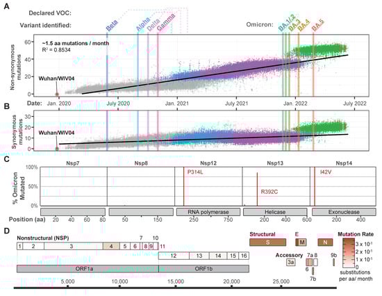(A) Non-synonymous mutations acquired over time in 26 SARS-CoV-2 protein sequences extracted from 97,437 genomes from 19 December 2021, to 17 June 2022 (GISAID accessions available at: https://github.com/WiedenheftLab/Omicron (accessed on 18 July 2022) and DOI: https://doi.org/10.55876/gis8.220721mv (accessed on 18 July 2022)). Genomes included in this analysis are a random sampling of 11,336,176 million SARS-CoV-2 from GISAID, which were quality filtered using NextClade (“good” overall QC status) then sampled with the Filter utility in NextStrain (selecting up to 120 genome per country per month of the pandemic) [1,14]. Variants of concern (VOC) are shown in bold and are colored as in Figure 1. Vertical lines mark the date the first sequence for each lineage was identified. The time elapsed between first detection and VOC designation by the WHO is shown as dotted lines above the graph. Dots are colored similar to variant names, and grey circles represent non-VOC lineage genomes. A linear regression line is shown in black. Omicron variants deviate from the trend. (B) Synonymous mutations in the SARS-CoV-2 genomes shown in panel (A). (C) Non-synonymous mutations in the Omicron RNA replication proteins (n = 13,094 genomes) are shown as red lines on schematic representations of each protein, and frequencies of each mutation shown as vertical lines (red). Most non-synonymous mutations are found in less than 1% of Omicron sequences. (D) Schematic depiction of SARS-CoV-2 protein coding sequences, with each gene colored according to its respective amino acid mutation rate. These rates are normalized to account for the length of each protein (i.e., substitutions/amino acids in protein/month of the pandemic).