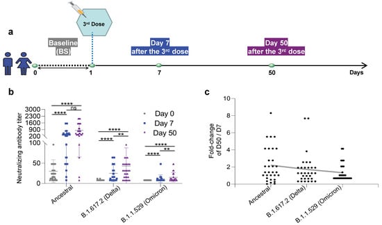 Study design and statistics of anti-SARS-CoV-2 neutralizing antibodies in inactivated SARS-CoV-2 KCONVAC vaccine participants. (a) Study design and sample collection timeline. Volunteer participants received 3 doses of the inactivated SARS-CoV-2 vaccine, and blood samples were collected at the indicated time points. (b) The inactivated vaccine was titrated with neutralizing antibodies against the ancestral, B.1.617.2 (Delta), and B.1.1.529 (Omicron). The data were presented to all donors. (c) Summary statistics of fold-change in neutralizing antibody titers for inactivated vaccines against ancestral, B.1.617.2 (Delta), and B.1.1.529 (Omicron) between 50 and 7 days after the third dose. Data are shown as the mean ± standard deviation (SD). BS: Baseline, prior to the third vaccination dose; D7: 7 days after the third dose; D50: 50 days after the third dose. N = 43 for BS; n = 35 for D7; n = 31 for D50. Each dot represents a single individual. ****: p < 0.0001, **: p < 0.01, ns: not statistically significant (p ≥ 0.05). Consistent p value notations are used throughout the paper.