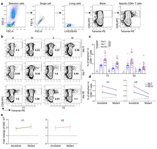 Comparison and characterization of B.1.617.2 (Delta) and B.1.1.529 (Omicron) epitope-specific CD8 T cells between vaccine recipients at 7 and 50 days after the third vaccination dose. (a) Flow cytometry gating strategy for SARS-CoV-2 epitope-specific CD8 T cells. (b,c) Comparison of CD8 T cells specific to ancestral and mutant SARS-CoV-2 epitopes in HLA-A2+ healthy donors 0 (gray), 7 (blue), and 50 (purple) days after the third dose of inactivated SARS-CoV-2 vaccine. Specific CD8 T cells were individually stained with tetramers prepared using ancestral and mutant B.1.617.2 (Delta) and B.1.1.529 (Omicron) epitopes. (b) Representative plot of (c), n = 18 per group. A: ancestral; M: mutant. Variant strain IDs are the same as listed in Table 1. The flow cytometry gating strategy is shown in (a). (d) Overall statistics and comparison of CD8 T cells specific to B.1.617.2 (Delta, left) and B.1.1.529 (Omicron, right) epitopes in HLA-A2+ healthy donors 0 (gray), 7 (blue), and 50 (purple) days after the third dose of inactivated SARS-CoV-2 vaccine. Data shown are the mean ± standard error of the mean (SEM), n = 18 per group. (e) Summary statistics of detection fold-change of CD8 T cells specific to B.1.617.2 (Delta, left) and B.1.1.529 (Omicron, right) epitopes between 50 and 7 days after the third dose. Data shown are the mean ± SD.