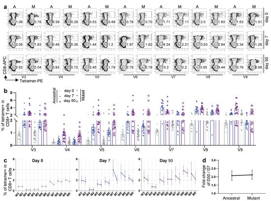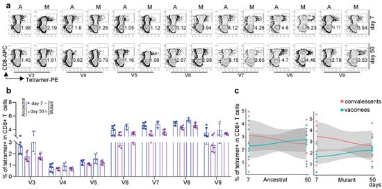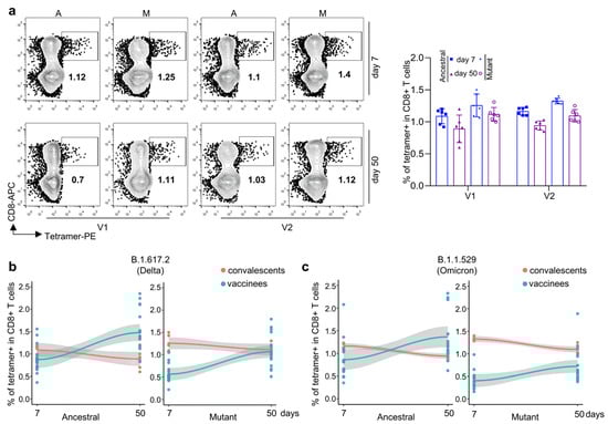 Characterization of mutant epitope-specific CD8 T cells in convalescent COVID-19 patients. (a) Representative data for the detection of epitope-specific CD8 T cells in HLA-A2+ convalescent COVID-19 patients who recovered from COVID-19 infection at 7 (top) and 50 days (bottom) with tetramers prepared using SARS-CoV-2 epitopes. (b) Overall statistics and comparison of CD8 T cells specific to ancestral and mutant SARS-CoV-2 epitopes in convalescent COVID-19 patients. Variant strain IDs are the same as listed in Table 1. Data shown are the mean ± SD. n = 6 for each group. (c) Fitted curves for ancestral (left) and mutant (right) epitopes at 7 and 50 days after the third dose of vaccination and 7 and 50 days after recovery from COVID-19 infection.