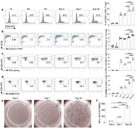To check the cytotoxic function of the antigen-specific CD8 T cells induced by the inactivated KCONVAC vaccine, we stimulated CD8 T cells with artificial antigen-presenting T2 cells loaded with mixed epitopes. As shown in Figure 4a, the T-cell activation marker CD69 significantly increased after epitope stimulation in vitro. We labeled the target cell (epitope-loaded T2 cells) with CSFE. The CFSE+ Annexin V+ apoptosis target cells increased in the samples containing the vaccinated CD8 T cells from day 0 to day 50 after KCONVAC vaccination (Figure 4b). The secretion of both IFN-g (Figure 4c) and GZMB (Figure 4d) increased significantly from day 0 to day 50 after vaccination. To further validate this hypothesis, we also analyzed the T-cell responses of the KCONVAC vaccine participants by ELISpot. The results showed the same cytotoxic function tendency for KCONVAC vaccine-induced CD8 T cells (Figure 4e,f). Our data showed an overall increase in CD8 T-cell cytotoxic function after the KCONVAC booster vaccination.