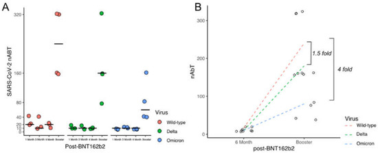 Figure 1. Increases in neutralising antibody titres (nAbT) four weeks after the third dose of Pfizer-BioNTech (BNT162b2). (A) Illustrates the neutralising antibody titre (nAbT) of SARS-CoV-2 variants Delta (green) and Omicron (blue) compared to wild-type (red, SARS-CoV-2 lineage A.2.2); black lines indicate the median titre at each time point. (B) Sera from four individuals collected six months after two doses of Pfizer-BioNTech (BNT162b2) and four weeks after the third dose of BNT162b2 vaccine (booster dose) demonstrate an increase in nAbT against all three variants. However, a 1.5- and 4-fold reduction in nAbT is observed for Delta and Omicron, respectively, compared to wild-type. Dashed lines depict the linear regression between individual titres (circles) pre- and post-BNT162b2 booster for each virus.