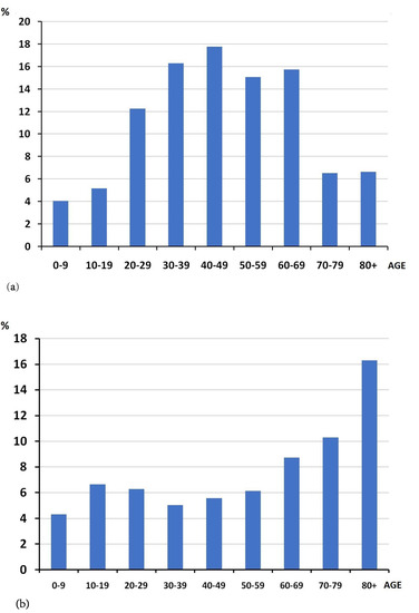 Despite the statements that children did not get sick in the first wave of COVID-19, about 4 percent of all cases were in children and 5% were in teenagers (Figure 1a), which contributed to the spread of infection through schools and children’s groups to families and older relatives. However, the incidence within the children in the 0–9 years age group was 4.3%, which is slightly lower than the incidence in the adults and teenagers (10–19 years—6.6%, more than 5 % in the other age groups, see Figure 1b).