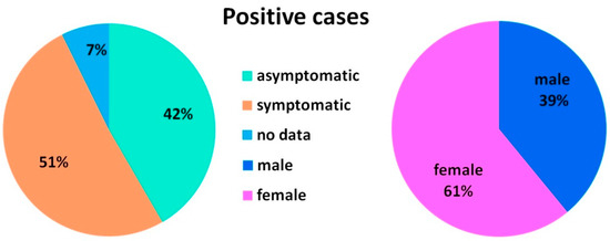 The percentage of symptomatic and asymptomatic people (left) and the percentage of male and female (right) among the positive for SARS-CoV-2 RNA.