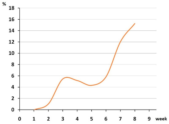Among all the people tested, 2423 came from different countries and 934 came from other Russian cities of 80 different destinations. For 321 identified cases of infection, it was known that there was contact with a carrier of SARS-CoV-2 and the rest were tested in accordance with the Regulation. Among all the positive cases, 27 people came to the Novosibirsk region from other regions and countries: 16 were from Moscow, 4 from Saint Petersburg, 3 from Yakutia, 3 from Thailand and 1 from Spain. According to the official data, the first case of the disease in the Novosibirsk region was detected on19March 2020 in a person who arrived from Italy in transit through Moscow [11]. Our laboratory began mass testing on1 of April 2020; however, there were only a few cases of SARS-CoV-2 detected at the beginning of April in Novosibirsk. We analyzed the number of positive cases for nineweeks in total fromApril 1 to 30 May 2020. The incidence of positive cases increased unevenly during the first eightweeks, showing a slight decline at four and fiveweeks, followed by a sharp increase between six and eight weeks. By the end of May (week nine), other laboratories inNovosibirsk had joined the testing;therefore, only partial data was available to us. Here we show the number of positive cases expressed as a percentage of the total number of tested people per week (Figure 3).