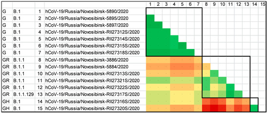 To assess the heterogeneity of the pool of primary structures of the genomes of the studied viruses, including that within the individual clades and genetic lines, a heat map based on the matrix of pairwise genetic distances was built (Figure 5). According to the heat map, within the GISAID clade, the G and GH sequences were minimally separated from each other, while the isolates of the GR clade were more different from each other. In addition, of all the three clades, the GR and the GH were the most distant from each other.