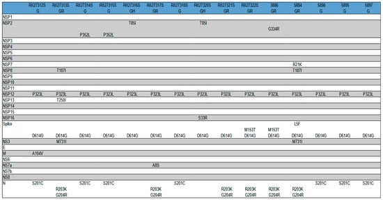 To assess the variability of the SARS-CoV-2 proteins, an analysis of the non-synonymous nucleotide substitutions in the corresponding coding regions of the virus genome was carried out. As a result, after translation of the sequences, the amino acid substitutions were identified in the primary structures of the SARS-CoV-2 proteins. It was found that the amino acid substitutions occurred in 11 out of 25 proteins of the virus (Figure 6). The main antigen of SARS-CoV-2 is the Spike protein (S). All the Novosibirsk isolates contained the D614G substitution in the Spike protein, two isolates were characterized by an additional M153T mutation, and one isolate was characterized by the L5F mutation. Most of the amino acid substitutions were localized in the other 10 proteins and probably did not affect the change in the antigenic characteristics of SARS-CoV-2. Thus, 12 out of 15 of the Novosibirsk isolates contained identical main antigens—Spike proteins. The mutation D614G, according to the literature, promotes an increase in virus replication and increases the infectivity of SARS-CoV-2 both in cell cultures and in animal models.