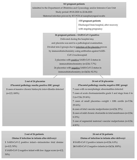 The final study group consisted of 26 patients who delivered a child at the university hospital in Wroclaw during the hospital stay and were not excluded from the study. Patients were divided into 2 groups: with positive IHC SARS-CoV-2 of placenta and negative IHC SARS-CoV-2 of placenta.