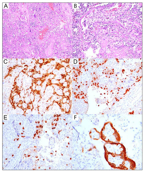 Severe pathological findings identified in a placenta with a positive SARS-CoV-2 immunoprofile from a SARS-CoV-2-positive mother. Neonate had a result positive result for a nasopharyngeal swab. Massive chronic intervillositis: (A): Intervillous space is massively involved by inflammatory infiltrate that significantly impairs fetal–maternal exchange and adversely affects fetal wellbeing; H&E-stained section at original magnification, 10×. (B): Destruction of the placental barrier is seen as early necrosis (loss of nuclear basophilia) of the villous trophoblast; H&E slide; original magnification, 20×. (C): The picture shows the predominant histiocytic component of the inflammatory infiltrate in the intervillous space; positive immunoexpression for CD68 antibody; original magnification, 20×. (D): The picture shows the CD3+ T-lymphocytes component of the inflammatory infiltrate in the intervillous space; positive immunoexpression for CD3 antibody; original magnification, 20×. (E): The picture shows the CD8+ T-lymphocytes component of the inflammatory infiltrate in the intervillous space; positive immunoexpression for CD8 antibody; original magnification, 40×. (F): SARS-CoV-2 placentitis: the picture shows strong positive and confluent immunoexpression in villous trophoblast for SARS-CoV-2 antibody. Placental viral infection triggered massive chronic intervillositis presented in (A–E); original magnification 40×.
