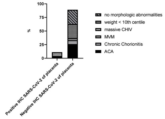 Placental pathology findings in the study. Two patients SARS-CoV-2-positive by IHC of placenta group and 24 patients SARS-CoV-2-negative by IHC of the placenta subgroup. Abbreviations: massive CHIV—massive chronic histiocytic intervillositis; MVM—maternal vascular malperfusion; ACA—acute chorioamnionitis.