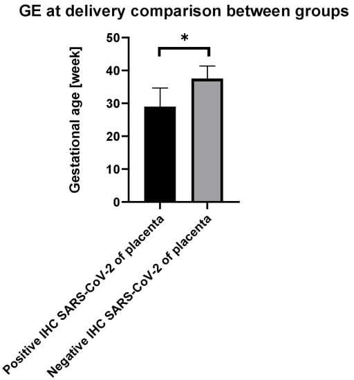 Comparison of gestational week at delivery of women with results of placental IHC for SARS-CoV-2 are presented below (Figure 4).