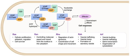 The small GTPases are molecular switches that undergo a cycle switch between an active GTP-bound form and an inactive GDP-bound state. Three sets of proteins can regulate these GTP-GDP switches. Guanine nucleotide exchange factors (GEFs) catalyze the activating exchange of GDP for GTP, GTPase activating proteins (GAPs) stimulate the intrinsic GTPase activity to inactivate the switch, and guanine nucleotide-dissociation inhibitors (GDIs) block spontaneous activation [16] (Figure 2). By hydrolyzing GTP, these GTPases act as molecular switches that interact with effector proteins and control the activity and function of a variety of specific targets, including enzymes, scaffolds, and accessory proteins, which are involved in a diverse array of cellular events [16].