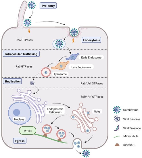 Currently, numerous studies on the CoV life cycle have been reported to explain CoV outbreaks [29]. Briefly, CoV initiates infection by binding to cell receptor(s) before entering the host cell and releasing the genome into the cytoplasm. Shortly after that, the viral membrane can either fuse directly with the host cell, or viruses are internalized via endocytosis [8]. Subsequently, CoV releases genomic RNA into the cytosol to initiate transcription and translation, capsid maturation, and envelopment, and ultimately virus egress from the host cell [29]. During CoV infection, the small GTPases, especially Rho, Rab, and Arf GTPases, are involved in the diverse processes of the CoV life cycle (Figure 3).