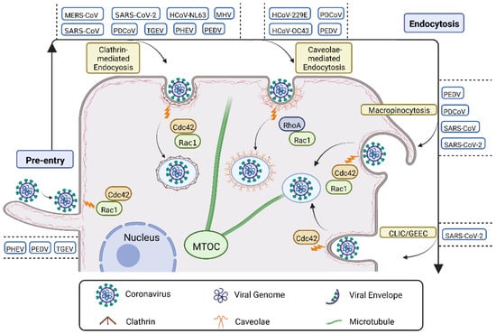 An overview of the roles of Rho GTPases in CoV infection. During pre-entry, CoVs (PEDV, TGEV, and PHEV) attach to the plasma membrane, and subsequently, land on the cell surface along the filopodia to locate specific receptor(s), which are Rac1 and Cdc42 dependent. The interaction between the specific virus-receptors can activate signaling cascades, guiding the virus internalization through one or more of the following pathways: clathrin-mediated endocytosis for MERS-CoV, PDCoV, HCoV-NL63, PHEV, MHV, SARS-CoV, SARS-CoV-2, TGEV, and PEDV infection with Cdc42 and Rac1 dependent; caveolae-mediated endocytosis for HCoV-229E, HCoV-OC43, PDCoV, and PEDV infection with RhoA and Rac1 dependent; macropinocytosis for PEDV, PDCoV, SARS-CoV, and SARS-CoV-2 infection with Rac1 and Cdc42 dependent; and CLIC/GEEC for SARS-CoV-2 infection with Cdc42 dependent. Abbreviations—MTOC: microtubule organizing center; CLIC/GEEC: clathrin-independent carrier/glycosylphosphatidylinositol-anchored protein-enriched endosomal compartments; PHEV: hemagglutinating encephalomyelitis virus; PEDV: porcine epidemic diarrhea virus; TGEV: transmissible gastroenteritis virus; MERS-CoV: Middle East respiratory syndrome coronavirus; SARS-CoV: severe acute respiratory syndrome coronavirus; PDCoV: porcine deltacoronavirus; MHV: mouse hepatitis coronavirus; HCoV-NL63: human coronavirus NL63; HCoV-229E: human coronavirus 229E; HCoV-OC43: human coronavirus OC43.