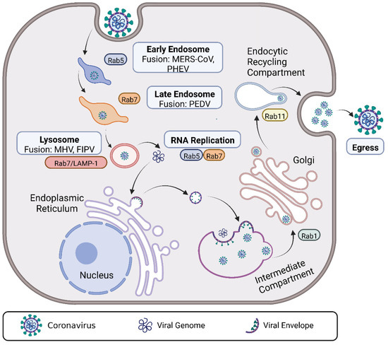As the acidic environment of endosomes can facilitate the infiltration of the incoming viruses into the host cytoplasm, thus, Rab GTPases, especially Rab5 and Rab7, are used for the productive infection of CoVs (Figure 5). In PHEV-infected mouse neuroblastoma (Neuro-2α) cells, Rab GTPases are not only involved in the trafficking of internalized PHEV but also play a crucial role in viral proliferation. By using the DiD-labeled PHEV, the colocalization between PHEV and Rab5 or Rab7 was found. Furthermore, a GTPase activation assay in this study suggested that the high-GTPase-activity isoform Rab5 could facilitate PHEV RNA replication and proliferation, while the dominant negative isoform Rab5 significantly inhibited the productive infection of PHEV [7]. Likewise, a study reported that silencing Rab5 and Rab7 could notably reduce viral RNA copy numbers and N protein expression levels of PDCoV via RT-qPCR and Western blot analysis [39]. Moreover, it was also reported that PDCoV and its entry cofactor aminopeptidase N (pAPN) colocalized with the endocytotic markers Rab5, Rab7, and LAMP1, suggesting that pAPN mediates PDCoV entry by an endocytotic pathway. More importantly, it was emphasized that regardless of receptor usage, only PDCoV entry via an endocytosis route ultimately leads to efficient replication [72]. These studies highlight the significance of Rab GTPases in CoV replication.
