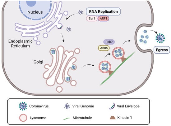 The roles of Arf GTPases in CoV infection. After genome release, MHV will experience RNA replication in the cytoplasm with the help of Sar1 and ARF1 GTPases. After viral replication and assembly, β-coronaviruses such as SARS-CoV-2 and MHV packed by lysosomes may undergo an anterograde movement along microtubules for egress, which is regulated by Arl8b and Rab7 GTPases. Abbreviations—MHV: mouse hepatitis coronavirus; SARS-CoV-2: severe acute respiratory syndrome coronavirus 2.