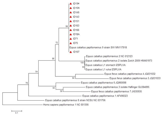 This study represents the first investigation on EcPV9 genoprevalence in horses worldwide and contributes to the description of EcPVs epidemiology in Italy, a viral infection for which data are still limited [36,37]. It also represents the first report of EcPV9 in the country, validated by molecular characterization of L1, phylogenetic analysis and viral genome reconstruction by NGS.