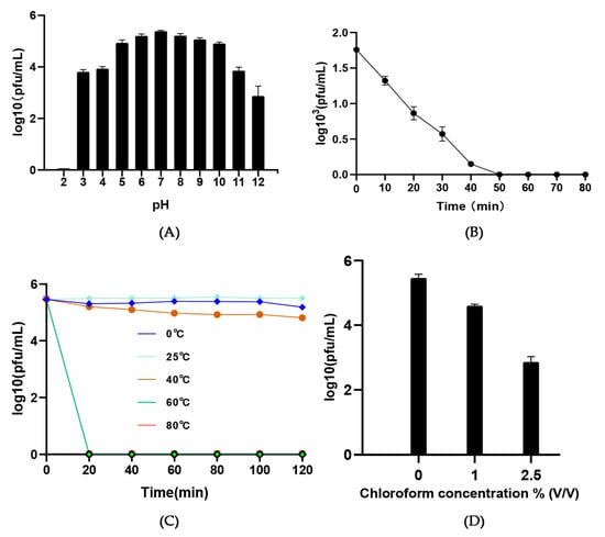 Physical and chemical tolerance test. (A) pH stability; (B) UV stability; (C) thermostability; (D) chloroform stability. All tests are performed in triplicate. Error bars indicate standard deviations.