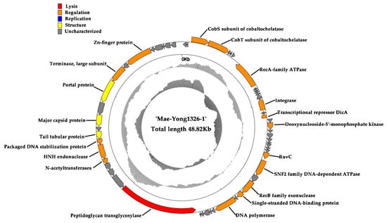 Lysis, DNA packing, and structure genes: ORF 38 of Mae-Yong1326-1 was predicted to encode a putative peptidoglycan transglycosylase, which can crack the peptidoglycan cell wall of host cell []. ORF 50 encodes a putative terminase large subunit, which mediates DNA packaging and performs nuclease activity, thus generating the terminal of the phage chromosome []. ORF 43 was predicted to encode a packaged DNA stabilization protein, the function of which is involved with stabilizing the condensed DNA within the capsid []. ORF 45, 47, and 49 encoded putative tail tubular protein, major capsid protein, and portal protein, respectively.