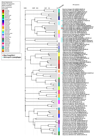 Phylogenetic proteomic tree of Mae-Yong1326-1, 9 reported Microcystis cyanophages, and 91 classified phages of the 33 families.