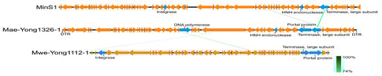 BLASTn search resulted that Mae-Yong1326-1 had the highest sequence similarity with Leisingera sp. NJS201 (accession number CP038234.1), but the query cover was close to 0; i.e., in practical terms, there is no homologous genome in the database. PASC is a web tool for the analysis of pairwise identity distribution within viruses []. PASC scanning with Mae-Yong1326-1 genome resulted that the maximum nucleotide sequence similarity between Mae-Yong1326-1 and the closest relative (Microcystis cyanophage MinS1) was only 17.75%, which was much lower than the threshold value of 70% to discriminate viral genus according to the International Committee on Taxonomy of Viruses (ICTV). In the VIRIDIC scanning with Mae-Yong1326-1 genome, the highest intergenomic similarities between Mae-Yong1326-1 and the closest relative (Microcystis cyanophage MinS1) was as low as 2%, which was far below the ≥70% boundary to define a genus. Results demonstrate that cyanophage Mae-Yong1326-1 reveals an unknown new genus. The ANI and isDDH values for Microcystis cyanophage Mae-Yong1326-1 and the closest relative, Microcystis phage MinS1, were only −1 and 12.5%, respectively. Terminase genes are considered to be a relatively conservative genes in Caudoviricetes class. In Blastp analysis, the large terminase subunit of Mae-Yong1326-1 shared only 55% of identity with the top hit and 33% with MinS1.The genome of a total of 91 classified phages of the class Caudoviricetes and the 9 reported freshwater Microcystis cyanophages were used as reference sequences to develop a proteomic tree, applying the online software ViPTree. In the proteomic tree (Figure 5) based on genome-wide sequence similarities, Mae-Yong1326-1 distantly clustered with three unclassified Microcystis cyanophages (MinS1, Mwe-Yong1112-1, and Mwes-Yong2). Like Mae-Yong1326-1, the highest similarities between MinS1, Mwe-Yong1112-1, Mwes-Yong2, and their closest relatives in PASC and VIRIDIC scanning were far below the ≥70% threshold to define a genus. Results indicated that Microcystis cyanophages Mae-Yong1326-1, MinS1, Mwe-Yong1112-1, and Mwes-Yong2 each reveal a new genus. These four Microcystis cyanophages form a monophyletic clade, separating at a node from the other clade formed by two families, Zierdtviridae and Orlajensenviridae, which are independent families of the Caudoviricetes class. Compared to Mwes-Yong2 and Mwe-Yong1112-1, the two Microcystis cyanophages, MinS1 and Mae-Yong1326-1, are more related. Genome comparison between Mae-Yong1326-1, MinS1, and Mwe-Yong1112-1 showed very low homology among them (Figure 6). Core Genes 5.0 (https://coregenes.ngrok.io/ (accessed on 10 July 2022)) analysis revealed no homologs shared by Mae-Yong1326-1, MinS1, Mwe-Yong1112-1, and Mwes-Yong2. Manual analysis revealed that all or some of them shared the homologs, including terminase, integrase, DNA polymerase, HNH endonuclease, and portal protein (Table 3). As mentioned earlier, cobT and cobS genes were reported to be core genes in cyanophages [,,]. Yet, except Mae-Yong1326-1, no cobT or cobS genes were found in the genomes of Mwes-Yong2, MinS1, and Mwe-Yong1112-1 in bioinformatics analysis. In addition, unlike Mae-Yong1326-1, no fixed phage terminus and direct terminal repeat was found in Mwes-Yong2, MinS1, and Mwe-Yong1112-1 genomes. This corresponded with the very low nucleotide sequence similarity and intergenomic similarities among them. All the above results suggest more diverse characteristics of freshwater Microcystis cyanophages than have been previously known. We propose to establish a new family and four subfamilies to harbor the four Microcystis cyanophages including Mae-Yong1326-1, MinS1, Mwe-Yong1112-1, and Mwes-Yong2.