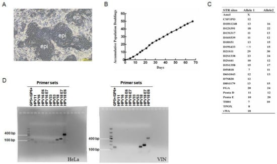 Establishment of vulvar intraepitheilial neoplasia (VIN) cells with naturally infected HPV genome. (A) The morphology of VIN cells (co-culture with feeder cells). The morphology image was taken with the phase contrast microscope. “epi” indicates epithelial/VIN cells. Scale bar: 200 μm. (B) The growth curve of VIN cells. The numbers of VIN cells were counted for each passage, and a plot of accumulated population doublings (PDs) versus growth days was constructed. (C) The short tandem repeat (STR) analysis of VIN cells. STR analysis of 21 loci plus the X-chromosome-specific Amelogenin locus was carried out. (D) HPV typing. DNA was isolated from cells, and PCR amplification was carried out using the specific primer sets listed: GP5+/GP6+ (lane 1, amplicon size 150 bp); HPV11 (lane 2, amplicon size 80 bp); HPV16 (lane 3, amplicon size 499 bp); HPV16 E6 (lane 4, amplicon size 453 bp); HPV16 E7 (lane 5, amplicon size 252 bp); HPV33 (lane 6, amplicon size 211 bp); HPV53 E6 (lane 7, amplicon size 263 bp); HPV18 (lane 8, amplicon size 172 bp); HPV18 E7 (lane 9, amplicon size 212 bp); HPV18 E6 (lane 10, amplicon size 439 bp). HeLa cells were set as a positive control (left panel). DNA Ladder used is DL 1000.