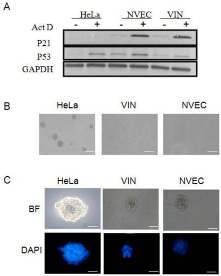 The tumor suppressor gene p53 functions to block abnormal cells that have suffered genetic damage and prevent abnormal proliferation. In response to DNA damage, normal cells possess the ability to up-regulate the expression of p53 and in turn activate the transcription of downstream effector p21, which arrests the cell cycle in G1 phase and inhibits abnormal cellular proliferation [23,24]. To investigate the biological characteristics of VIN cells, we analyzed the DNA damage response to actinomycin D (Act D) treatment (Figure 2A). The results showed that NVEC (normal cells) increased the expression of both p53 and p21 after Act D treatment. In contrast, HeLa (tumor cells) occasionally increased the expression of p53 but not the downstream effector p21 and lost the ability to inhibit abnormal proliferation. Compared with NVEC and HeLa, VIN cells had the intact p53-mediated growth-related pathways and functions to respond to the DNA damage (Figure 2A). Next, we analyzed the transforming property of VIN cells using anchorage-independent growth assay (soft agar). As shown in Figure 2B, colonies were observed with HeLa cells after 7 days culture in soft agar. VIN cells, the same as normal NVEC, did not form colonies in soft agar even after 30 days of culture (Figure 2B). Since matrigel contains multiple growth factors, maintaining normal homeostasis and tissue morphology [19], matrigel three-dimensional (3D) culture has been widely used to evaluate differentiation potential of cells in vitro [14,16]. As shown in Figure 2C, compared with HeLa cells (irregular-sphere aggregates), VIN and NVEC cells were similar in that they formed normal differentiated, well-organized, and smooth spheres in matrigel 3D cultures. Taken together, our results demonstrated that VIN cells maintained very different biological characteristics and differentiation potential in vitro long-term cultures compared with the HPV18-positive HeLa cancer cells.
