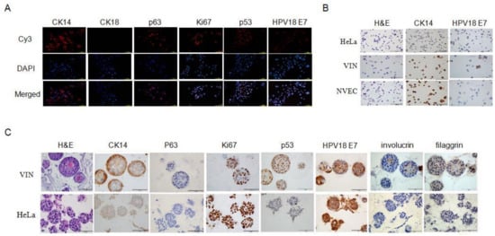 To verify the origin of the VIN cells, we analyzed the expression of squamous epithelium specific markers using immunofluorescence and DAB staining. The cytokeratin (CK) expression was positive for CK14 and negative for CK18 (Figure 3A), indicating that VIN cells originated from the stratified squamous epithelium. The stemness marker p63 has been shown as a specific marker for CR cells [16]. VIN cells were established using CR method and stained positive for p63 (Figure 3A). Ki67, a marker of cell proliferation, also stained positive (Figure 3A), indicating that VIN cells possess the ability of proliferation under CR condition. The expression of HPV18 E7 and p53 was stained positive in the majority of VIN cells, while NVEC was stained negative for HPV18 E7 (Figure 3A,B). We also analyzed the expression of the above markers in matrigel 3D cultures of VIN cells. H&E staining showed the normal differentiated structure of VIN cells but not of HeLa cells in matrigel 3D cultures (Figure 3C). As an adenocarcinoma cell line, HeLa cells do not express squamous epithelium specific marker CK14 in 3D matrigel culture (Figure 3C). HeLa cells were stained negative for P63, P53, involucrin (early differentiation marker), and filaggrin (late differentiation marker) but strongly positive for Ki67 and HPV18 E7 (Figure 3C). These results demonstrated that HeLa cells lost the normal biological function and differentiation potential and gained malignant proliferation. In contrast, VIN cells were positive for CK14 and partially positive for P63, Ki67, p53, HPV18 E7, involucrin, and filaggrin in 3D matrigel culture (Figure 3C), indicating that VIN cells maintained the cell type-specific differentiation potential without malignant proliferation (Figure 2B and Figure 3C).