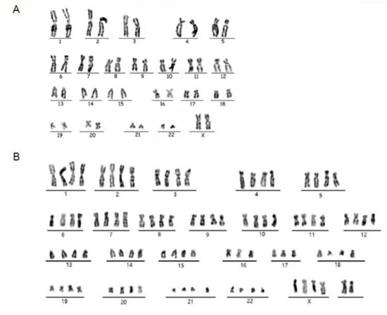 We have shown that VIN cells contained HPV18 DNA (Figure 1D) but did not have the ability of anchor-independent growth (Figure 2B). VIN cells maintained different biological characteristics and differentiation potential from HeLa cells (Figure 2A,C). A previous study showed that conditionally reprogrammed cells (CRCs) are karyotype stable [14]. Next, we performed the karyotype analysis of VIN cells. The results showed that both diploid (Figure 4A) and tetraploid (Figure 4B) karyotypes were observed with VIN cells. More than 70% of VIN cells were observed as diploid, which is in accordance with the biological characteristics of VIN cells. The minority of tetraploids in VIN cells may result from persistent HPV18 infection and the expression of viral oncoproteins.
