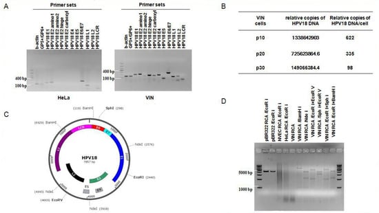Identification of HPV18 DNA and viral genes in VIN cells. (A) Identification of HPV18 viral genes in VIN cells. DNA was isolated from VIN cells. HeLa were set as control cells. The following specific primer sets were used for PCR: β-actin (lane 1, amplicon size 142 bp), GP5+/GP6+ (lane 2, amplicon size 150 bp), HPV18 E1 (lane 3, amplicon size 205 bp), HPV18 E2 amino 1 (lane 4, amplicon size 223 bp), HPV18 E2 amino 2 (lane 5, amplicon size 157 bp), HPV18 E2 hinge (lane 6, amplicon size 192 bp), HPV18 E2 carboxyl (lane 7, amplicon size 177 bp), HPV18 E4 (lane 8, amplicon size 204 bp), HPV18 E5 (lane 9, amplicon size 85 bp), HPV18 E6/E7 (lane 10, amplicon size291 bp), HPV18 L1 (lane 11, amplicon size 149 bp), HPV18 L2 (lane 12, amplicon size 165 bp), and HPV18 LCR (lane 13, amplicon size 70 bp). DNA ladder used is DL 1000. (B) Relative copies of HPV18 DNA/cell in VIN cells in different passages. DNA was extracted from VIN cells. A recombinant plasmid pUC19-HPV18 E2/E7 was used to generate standard curve. The primer set of HPV18 E7 was used for Q-PCR. The corresponding HPV18 DNA copies and relative copies of HPV18 DNA/cell were calculated as described in Materials and Methods. (C) Map of prototype of HPV18 genome and cutting sites by restriction enzymes. (D) Digested fragments of RCA amplification products of HPV18 DNA. DNA was isolated from VIN cells. One ug of DNA stock solution was used as template for RCA amplification. And then RCA products were digested with restriction enzymes. The digested fragments of HPV18 were loaded for agarose gel electrophoresis as following: lane 1, pBR322 RCA (EcoRI); lane 2, pBR322 (EcoRI); lane 3, NVEC RCA (EcoRI); lane 4, HeLa RCA (EcoRI); lane 5, VIN RCA (no enzyme); lane 6, VIN RCA (BamHI); lane 7, VIN RCA (NdeI); lane 8, VIN RCA (EcoRI + EcoR V); lane 9, VIN RCA (SphI + EcoRⅤ); lane 10, VIN RCA (EcoRI + SphI); lane 11, VIN RCA (EcoRI + BamH I). DNA Ladder used was 1 Kb DNA Marker.