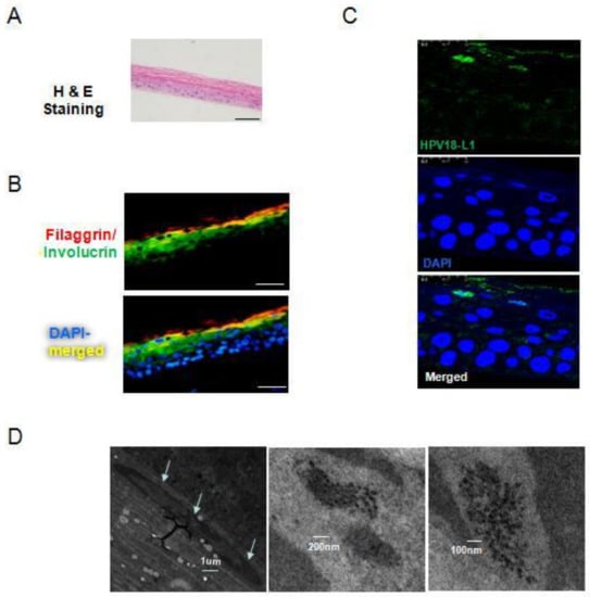 Differentiation-dependent expression of HPV18 late protein and viral particle assembly under ALI 3D cultures. (A) H&E-stained section of VIN cell-derived ALI 3D culture. ALI 3D culture of VIN cells was harvested on day 18 and fixed with 4% (w/v) paraformaldehyde, paraffin embedded, and sectioned. The images of H&E staining were photographed. Scale bar, 100 μm. (B) Co-localization of filaggrin and involucrin in VIN cell-derived ALI 3D cultures. Immunofluorescence analysis was carried out using specific primary antibodies against filaggrin and involucrin. Nuclei were stained with 0.5 μg/mL DAPI. Scale bar, 50 μm. (C) Immunofluoresence detection of the major capsid protein L1 in VIN cell-derived ALI 3D cultures by confocal microscope. VIN cells were seeded in the inserts for ALI 3D cultures and harvested at day 18. Then ALI cultures were fixed, paraffin embedded, sectioned, and stained with primary antibody against HPV18 L1 with immunofluoresence analysis. The nuclei were stained with 0.5 μg/mL DAPI. (D) Detection of HPV18 virions in VIN cell-derived ALI 3D cultures under transmission electron microscope (TEM). VIN cells were cultured in ALI and harvested at day 18. Then ALI cultures were fixed, and ultrathin sections were made after staining and observed under TEM. Scale bar, 1 μm, 100 nm, 200 nm.