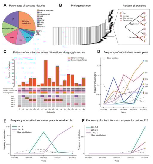 The temporal dynamics of egg passage adaptation. (A) The passage histories of the strains in the dataset (D1). (B) The phylogenetic relationships of all the sequences (Dataset D2). The inset illustrates the branches supporting egg passage adaptation (i.e., “egg branches”), which included both monophyletic groups for the egg-passaged sequences (i.e., “egg clade”), as well a single egg-passaged sequence (i.e., “egg terminal”). (C) The eighteen residues driving egg passage adaptation. The top bars indicate the number of nonsynonymous and synonymous changes (for a given sample history). The middle rows indicate the significance of the three statistical tests (Methods). The bottom plot shows whether the 18 residues are in the RBS (receptor binding sites) or antigenic domains A–E. (D) The temporal changes in the frequencies of substitutions at the 18 residues (only a few key residues, 156, 160, 219, 225, 194 and 186, are labelled). (E) The temporal changes in the frequency of different substitutions at residue 194. (F) The temporal changes in the frequency of different substitutions at residue 225.