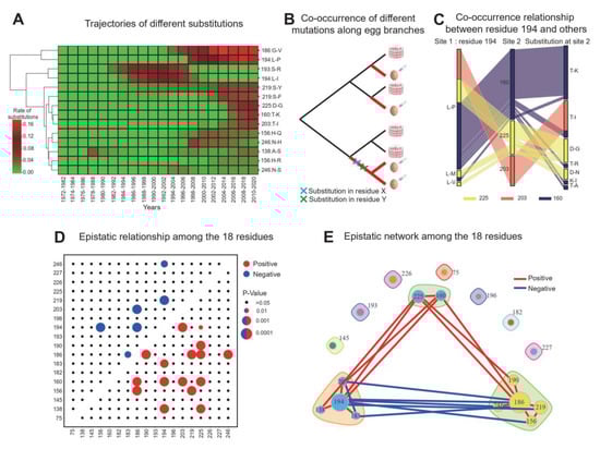 We used the contingency test to investigate whether pairs of residues tend to have substitutions along egg branches more or less frequently than expected if the mutations occur independently of each other (Figure 2B). In particular, for each pair of residues, we categorized all egg branches into B00 (no mutation in either residue), B01 (no mutation in the first residue but has mutations in the second residue), B10 (has mutations in the first residue but no mutation in the second residue) and B11 (has mutations in both residues). We categorized possible pairs of residues into positively (co-occurring) and negatively (mutually exclusive) interacting residues. The network structure reflecting these interacting relationship was drawn in R using igraph (https://igraph.org/, 15 September 2020), and the network modules are available at (https://www.rdocumentation.org/packages/dna/versions/2.1-2/topics/network.modules, accessed on 15 September 2020).