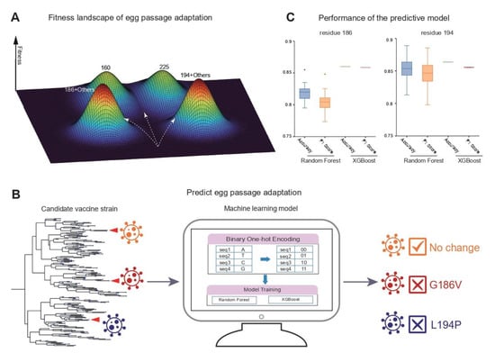 The fitness landscape and machine learning models. (A) A cartoon illustration of the fitness landscape of the egg passage adaptation. As residues 186 and 194 are two dominant codons correlated with vaccine efficacy, we thus summarized the evolutionary trajectories of egg passage adaptation into three possible evolutionary paths: (1) those with substitutions in residue 186 (no change in residue 194), (2) trajectories with substitutions in residue 194 (no change in residue 186) or (3) no changes in any of the two residues. (B) A schematic flow of the PEPA (Predicting Egg Passage Adaptation) (Methods). In the cross-validation, we trained the model on 80% of all the egg-passaged sequences (n = 688) and tested the model on the other 20% of the data. (C) The performance of the Random Forest and XGBoost model.