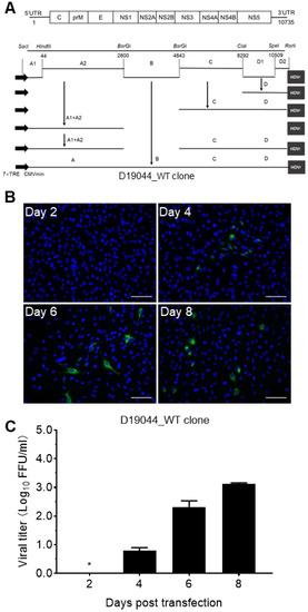 To overcome the instability of DENV cDNA clone in transformant E. coli bacteria, we selected a low-copy plasmid pTight, which was modified from pBR322 [19,20]. We and others have previously used this vector for development of infectious clones of JEV, DENV, and ZIKV [18,19]. To construct a D19044 full-length clone, we divided its genomic cDNA into four fragments A, B, C, and D, by restriction sites (Figure 2A); fragment A was fused from sub-fragments A1 and A2, while D was a fusion of D1 and D2 (Figure 2A and Section 2). Partial sequences of 5′UTR (nts 1–49, mainly A1 fragment) and 3′UTR (nts 10,509–10,735, D2 fragment) were obtained from isolate GZ2002 (JN205310) [21]. Inexplicably, we found that the cloning was restricted and selective by the order of fragment cloning into the pTight vector. When fragments were cloned in the order of C → D → A, namely fragment A was first cloned into the vector to get pTight-A, followed by adding D to pTight_A to make pTight_A-D, then C was added in to get pTight_A-C-D, all 70 colonies from three independent ligation-transformation experiments carried multiple nucleotides and/or amino acid substitutions or deletions. In subsequent attempts, we tested different orders of fragment cloning and found that D19044 full-length clone could be constructed only in the order B → A → C → D, namely D was first cloned to get pTight_D, followed by adding C to make pTight_C-D, and then adding A to obtain pTight_A-C-D. Finally, B was added to generate full-length D19044 wild-type cDNA clone (D19044_WT). All subclones and final D19044_WT clone were confirmed by Sanger sequencing (Figure 2A).