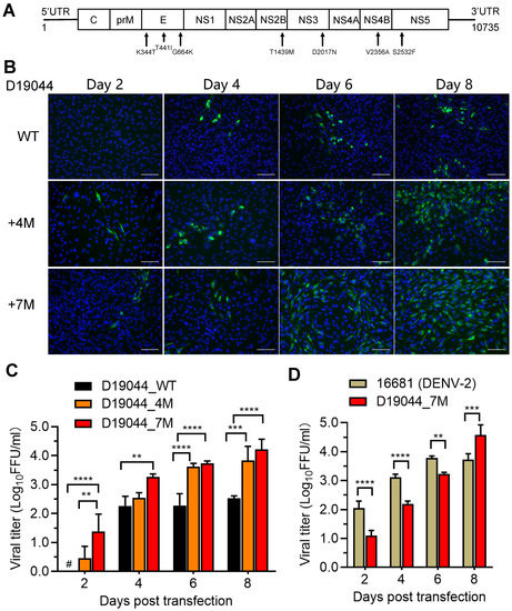 To determine whether amino acid substitutions enhance virus production, we transfected D19044_4M, D19044_7M, and D19044_WT clones into BHK-21 cells and examined the viral titers of culture supernatant at different time points post transfection (p.t.) (Figure 3B,C). D19044_4M and D19044_7M produced DENV, with detectable titers at day 2 p.t., while D19044_WT was undetectable. At day 4 p.t., virus spread and titers of D19044_7M were higher than that of D19044_4M and D19044_WT by 5.1~8-fold; at days 6 and 8, D19044_4M and D19044_7M were higher than D19044_WT by 16.5~20.7 and 29.8~60.1 fold, respectively (Figure 3C). D19044_7M reached peak titer (7.5 × 104 FFU/mL) at day 8 p.t. and higher than D19044_4M (2.24 × 104 FFU/mL) (Figure 3C). The recovered viruses were confirmed by sequencing analysis, and all amino acid substitutions engineered were maintained. Thus, passage-recovered amino acid substitutions promoted virus production of D19044 clone, and D19044_7M represented most efficient clone for subsequent experiments.