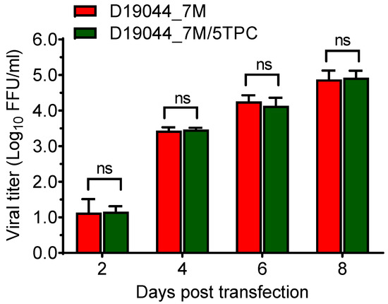 Next, we tested the capacity of producing viral particles for D19044_7M/5TPC in comparison to D19044_7M. Both clones released infectious viruses with comparable viral titers at days 2, 4, 6, and 8 following plasmid transfection of BHK-21 cells. Peak viral titers peaked at day 8 (1 × 105 FFU/mL), indicating that A2355G did not affect production of infectious virus (Figure 4). Moreover, no other deletion and amino acid substitution was found in the genome, especially in substitution- and deletion-prone region, prM-E-NS1 [18,30]. Thus, we considered D19044_7M recombinant was genetically stable in bacteria, feasible for molecular manipulation.