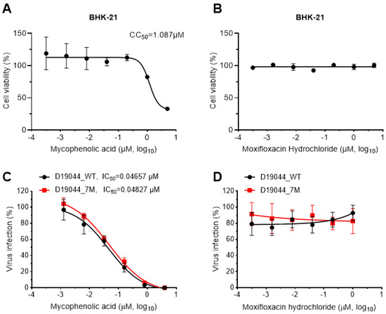 D19044 was inhibited antiviral compound in a dose-dependent manner. (A,B) The cell viability of BHK-21 cells under the treatment of mycophenolic acid (MPA) and moxifloxacin hydrochloride. (C) MPA inhibited D19044_7M and D19044_WT in a dose-dependent manner with comparable IC50 (0.04827 μM and 0.04657 μM). (D) Moxifloxacin hydrochloride did not inhibit D19044_7M and D19044_WT viruses. In C and D, BHK-21 cells were infected with D19044_7M and D19044_WT with MOI of 0.1 for 2 h, and then incubated with drugs of different concentrations for 48 h. The infection rates were examined by IFA and normalized to the nontreated mock controls. The means ± SEM of four determinations are shown.