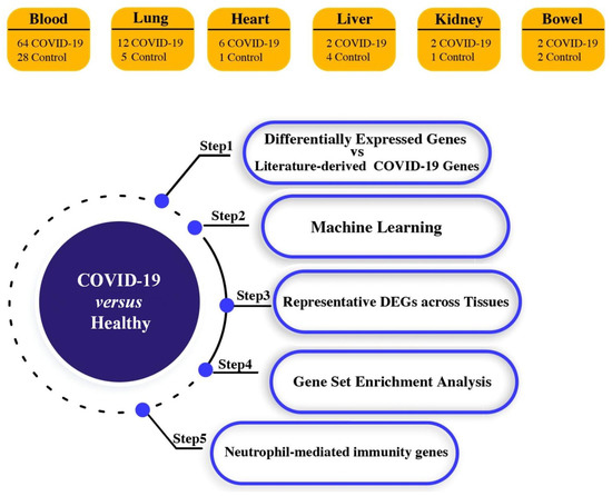 In order to explore the transcriptional dynamics of the human host with respect to SARS-CoV-2 infections, we profited from publicly available RNA-Seq datasets, which were exploited to identify the DEGs of SARS-CoV-2-positive and –negative subjects. To this end, the relevant gene expression data from six different tissues of SARS-CoV-2-positive (COVID-19) and SARS-CoV-2-negative (control) individuals were processed and analyzed by employing an integrated computational methodology.