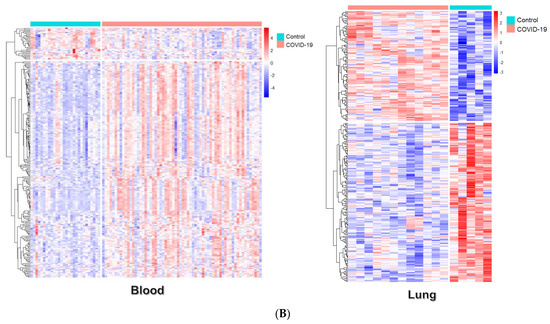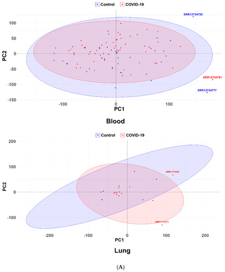 The distribution of the COVID-19 and control samples in the blood and lung tissues according to a principal component analysis is shown in Figure 2A. In the blood PCA plot, three outlier samples were detected outside the circle (SRR11734755, SRR11734777, and SRR11734781) which were not included in the subsequent steps of the analysis; similarly, two outliers (SRR11772361 and SRR11772371) were detected in the lung PCA plot. After the removal of the outliers, a total of 64 COVID-19 and 28 control samples were considered for further analysis in the blood tissues, and, also, 12 COVID-19 and 5 control samples were considered in the lung tissue (Table S1). The tissues of the heart, liver, kidney, and bowel had a small number of samples (Table S1), and, thus, a methodology different from the one used for the detection of DEGs in the blood and lung samples was applied.