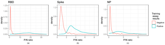 Distribution of P/N ratios illustrate cut-off values for ELISA assays: Kernel density estimates of the P/N ratios for the ELISA assays. Panels (a–c) illustrate RBD, Spike, and NP ratios, respectively. The RBD and spike panels show the secondary training data, while the nucleocapsid panel shows the dataset of interest. Training assay data results are those of the neutralization assay for RBD and spike and the Abbott results for the nucleocapsid panel.