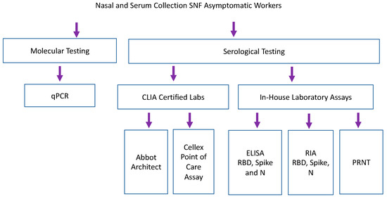 Samples collected from nursing home facilities were tested by qPCR, CLIA certified serological testing, and in-house lab assays including RBD, spike and nucleocapsid ELISAs and RIA (Figure 3). Staff participated in weekly qPCR surveillance testing at 6 different skilled nursing facilities [7]. Serum was collected from a single time point, 1–6 weeks after surveillance testing began [7]. 186 samples were analyzed by eight antibody binding assays (2 CLIA laboratory assays, 3 laboratory-based ELISAs and 3 laboratory-based RIA). Forty-five samples were run on functional PRNT. Abbott Architect assessed IgG and IgM versus SARS-CoV-2 nucleocapsid antigen [14]. Cellex point of care assay assessed IgG and IgM against nucleocapsid and spike antigens [13]. Because samples were taken in May 2020, none of the study participants were vaccinated against COVID-19, and a COVID-19 infection more than two months prior to the study is quite unlikely given the United States lockdown, which began in March of 2020.