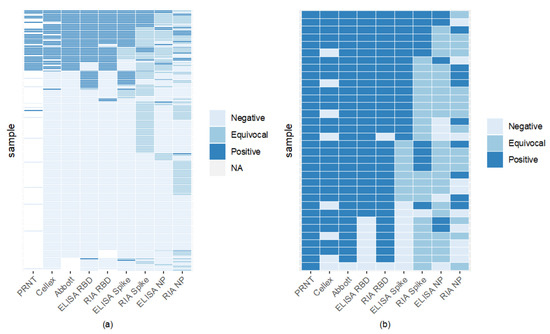 Inter-assay comparisons reveal high RBD binding assay sensitivity and specificity. Each horizontal line indicates an individual sample tested by one of 8 binding assay methods. ELISA values below the negative cut-off determined by P/N were deemed negative; those above the positive cut-off were considered positive. Values between upper and lower cut-offs were equivocal. 66% (122/186) of samples were seronegative by all serological assays (light blue lines). Panel (a) includes samples tested on PRNT and all 8 binding assays. Panel (b) compares PRNT positive samples (gold standard positive) to the 8 other serological assays.