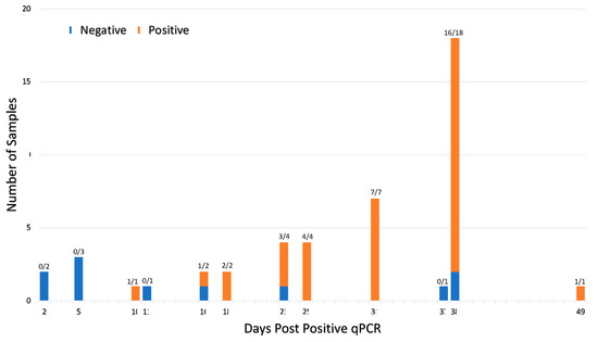 Comparison of qPCR and serologic data in our pre-vaccination cohort illustrates multiple individuals without reported SARS-CoV-2 infection had significant antibody responses, indicating previously infected individuals who had not been tested via qPCR because of the lack of test availability during early phases of the epidemic (Table 1). Abbott BinaxNOW antibody detection identified seropositive patients with qPCR Ct values 25–30 [26,27], but not in patients where viral loads were lower than 4.04–8.06 copies/swab [27]. In one population, this corresponds to missing 40% of qPCR positive in-hospital patients [27]. Assessment of seroconversion in comparison to qPCR testing identified significant individual variation in time to seroconversion (Figure 6) and provided a characterized bioarchive for future serologic test development.